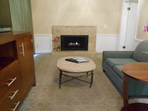 This non-smoking room is appointed with one bedroom with one King bed and a second bedroom with two twin beds.The living room features a sitting area, flat-screen television and fireplace.